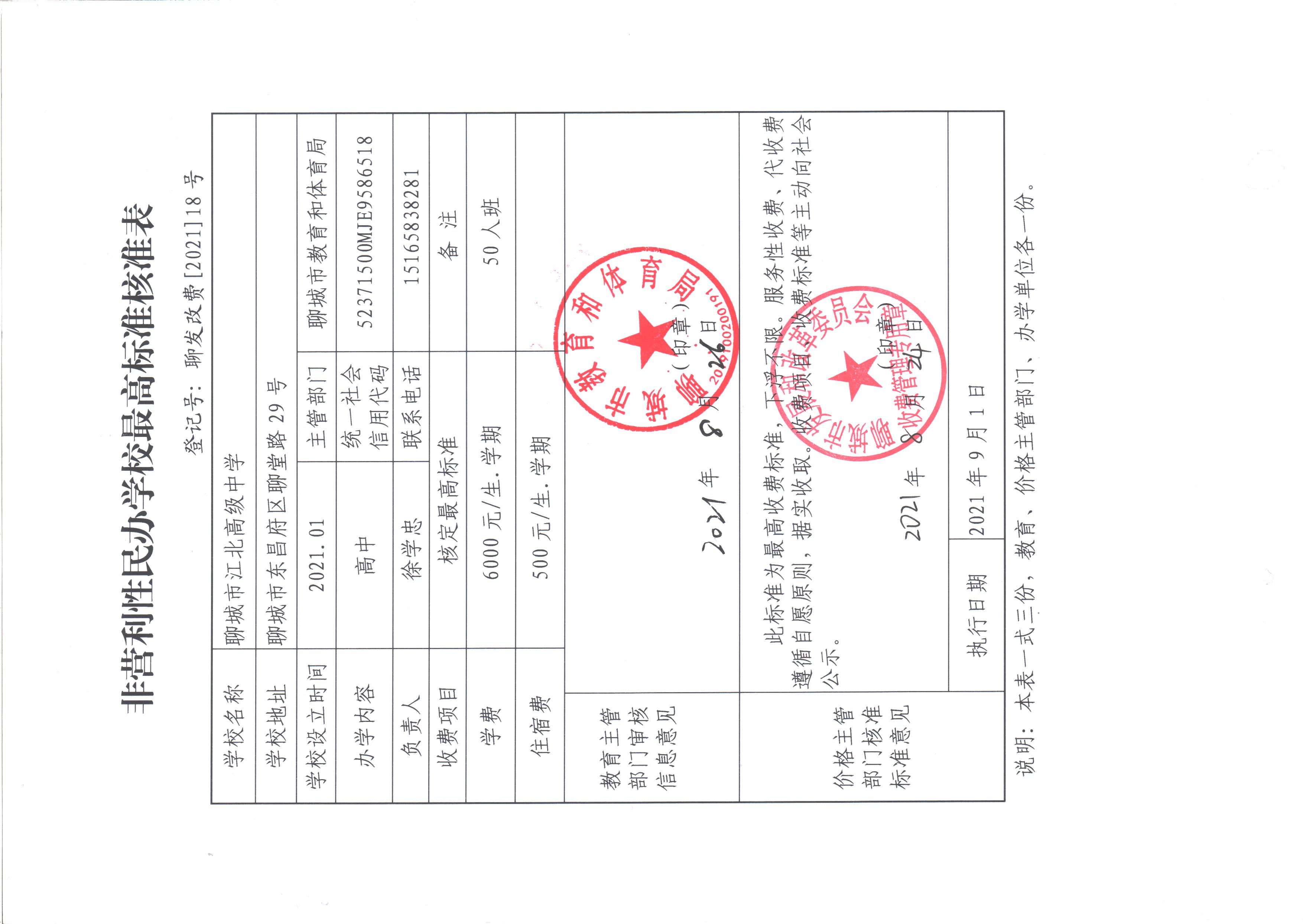聊城市江北高中2025年收费标准公示